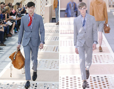 Дизайн костюмов от Louis Vuitton вдохновлен американской классикой. Костюмы в светлых тонах, стильная клетка и подвернутые один раз рукава пиджаков – все очень непринужденно, но вместе с тем невероятно стильно и оригинально.